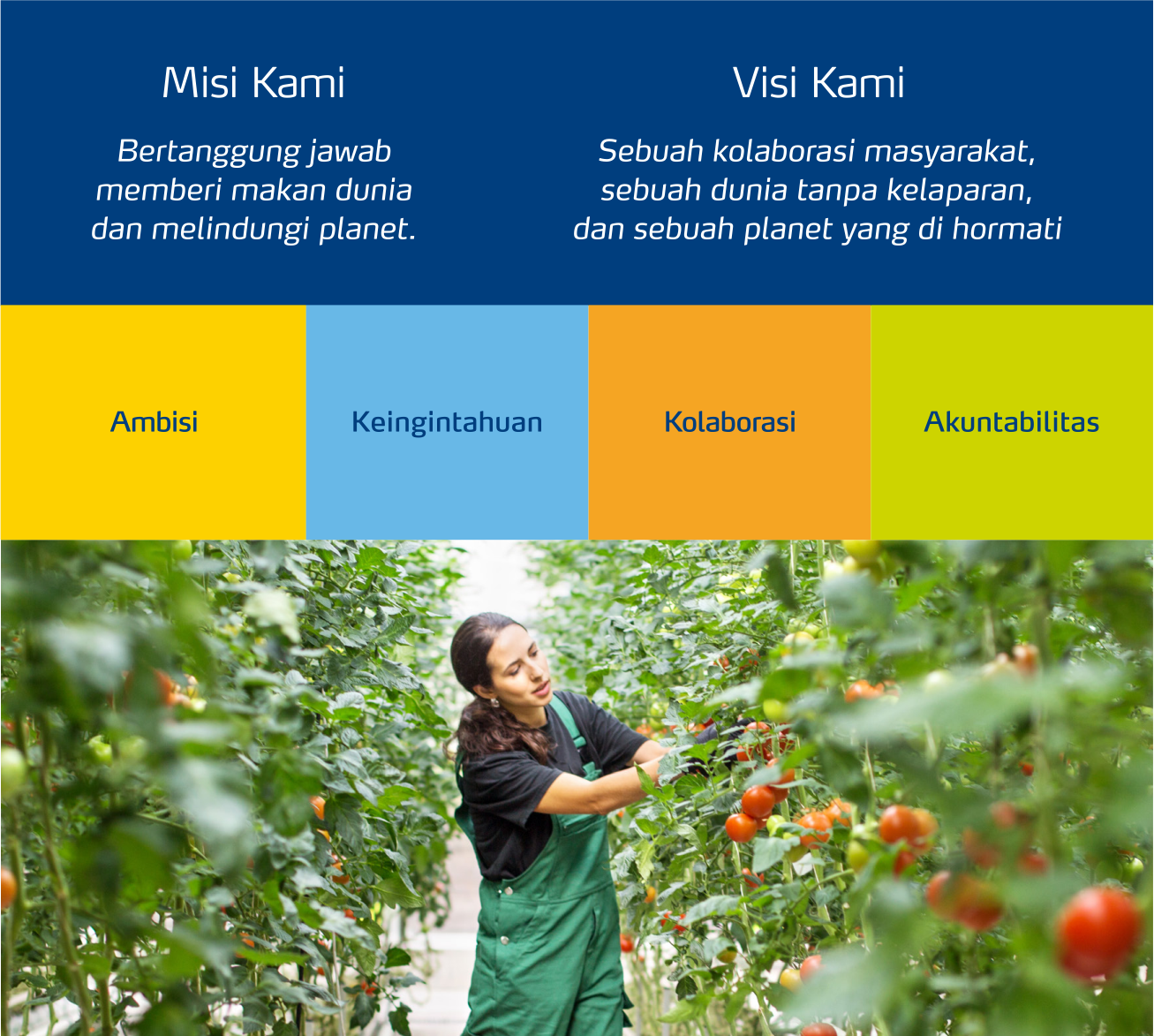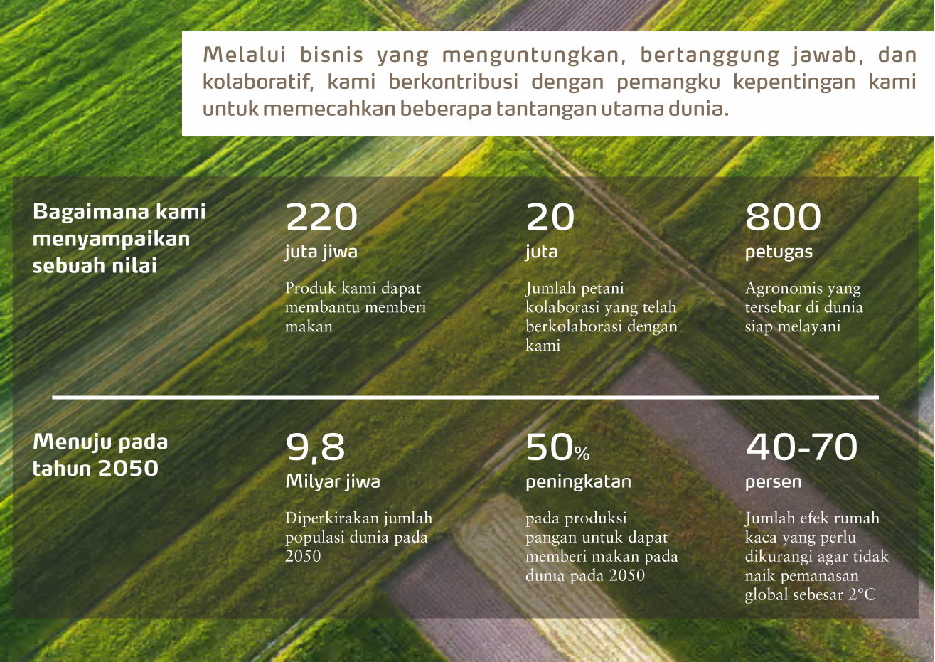 Kami berkomitmen untuk menciptkan nilai bagi pelanggan, pemangku kepentingan , dan masyarakat kami secara luas. Untuk mencapai misi kami memberi makan dunia secara bertanggung jawab dan melindungi planet ini, kami telah memimpin dalam pengembangan alat pertanian digital untuk pertanian yang presisi, dan bekerja sama dengan mitra untuk meningkatkan keberlanjutan pertanian dan produksi makanan.